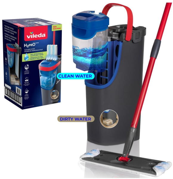 A Vileda márka H2PrO felmosója egy innovatív rendszer, amely biztosítja, hogy a tiszta és a piszkos víz teljesen külön maradjon. Frissen tartja a felmosót, és hatékonyan tisztít. A környezetbarát kialakítás mindössze 1,2 liter vizet igényel, és akár 60 m2 megtisztításához alkalmas, így jelentősen kevesebb vizet használ, és akár 75%-kal csökkenti a vízfogyasztást. A tartós felmosólapon található fejlett mikroszálas technológia még a makacs szennyeződésekkel is megbirkózik, és csíkmentes felületet hagy minden típusú padlón. Karcsú, függőleges kialakítással rendelkezik, amely még kis helyiségekben is könnyű tárolást biztosít. Könnyű egykezes használatra tervezték, és innovatív csavaró mechanizmussal rendelkezik, amely csökkenti a fizikai erőfeszítést. A nyél négy részből áll, és 130 cm hosszúságot ér el. A rendszer érzékelő vízfúvókákkal van felszerelve, amelyek csak tiszta vizet permeteznek a levehető felmosólapra, így biztosítva az egyenletes áztatást. Az átlátszó víztartály kivehető, könnyű és könnyen tölthető, bármely mosogató alá illeszkedik. A 360°-os csuklóval ellátott felmosókeret lehetővé teszi a sarkok és a nehezen hozzáférhető területek hatékony tisztítását, míg a felmosólap a tépőzárnak köszönhetően könnyen fel- és levehető. A felmosólap mosógépben mosható, ami megkönnyíti a karbantartását. Az automatikus rugós csavarkamra megkönnyíti a kicsavarást, és segít eltávolítani a szennyeződéseket a laptól, miközben optimális nedvességszabályozást biztosít.